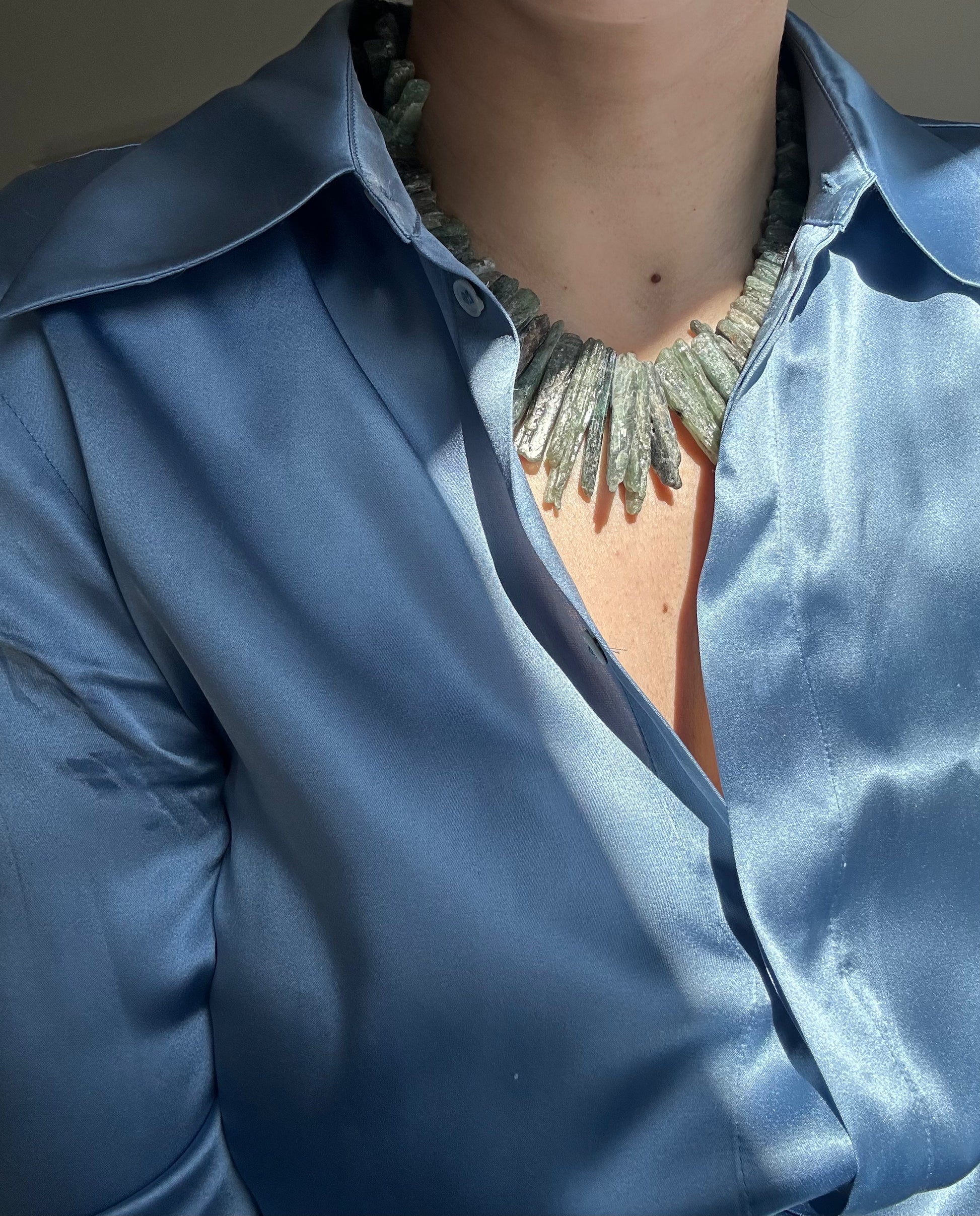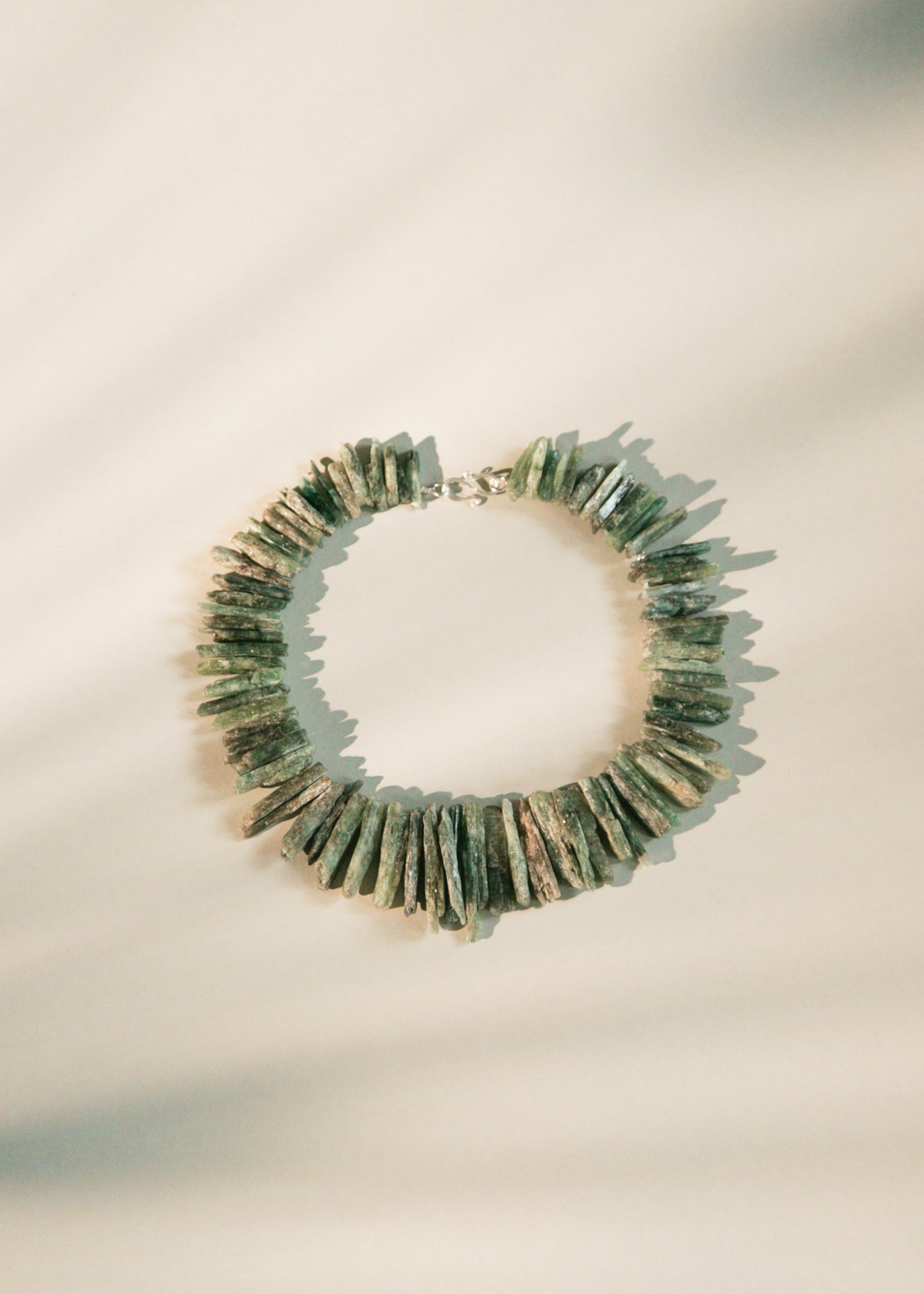 Spiritually, green kyanite is believed to promote a connection whit nature, Align the heart and forehead chakras and promote spiritual growth. It is used to facilitate communication with nature spirits and higher guides, open one to loving vibrations, and aid in self-love and compassion. It can also help one receive guidance and discern truth from one's heart.