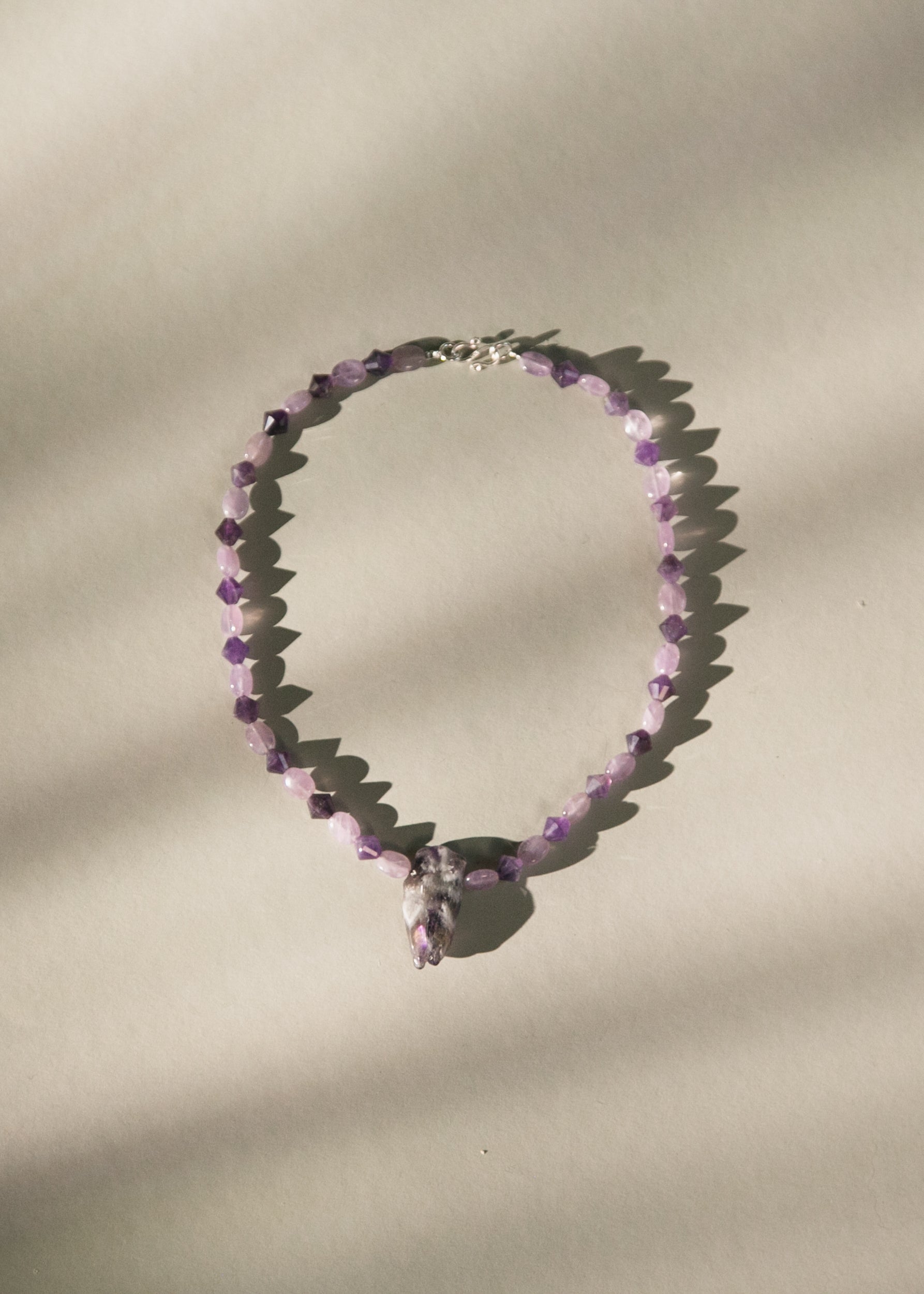 Necklace with amethyst stones. Amethyst is associated with benefits like stress relief, enhanced clarity and improved intuition. It is also believed to promote emotional balance, spiritual growth, and better sleep. Physically, it is thought to help with issues like tension headaches and support the immune system.