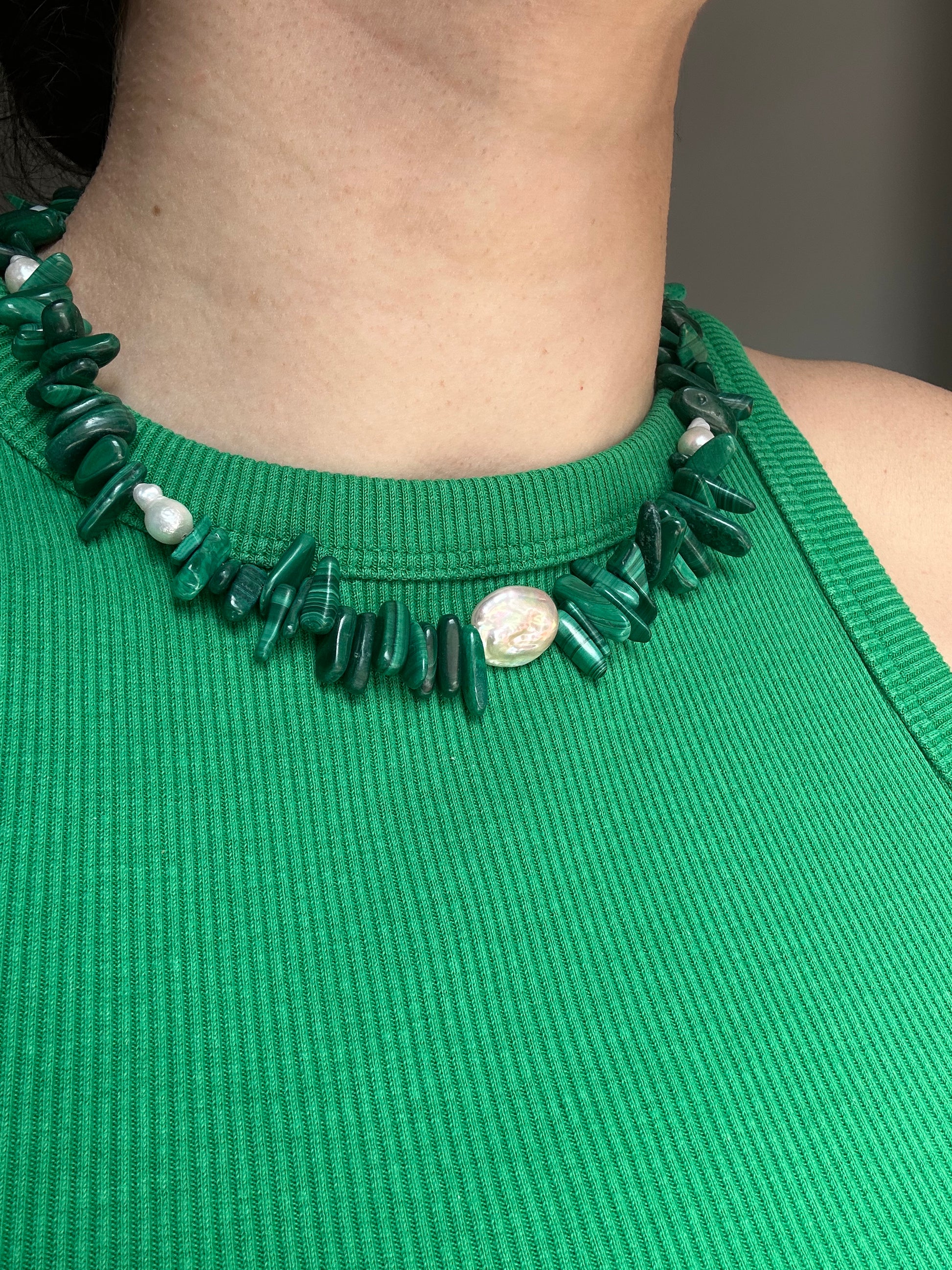 Necklace made with malachite stone and freshwater pearls.
